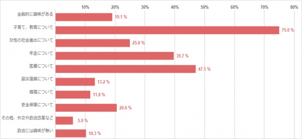 75%のママさんが「子育て、教育について」の分野に興味があるとお答えになりました。