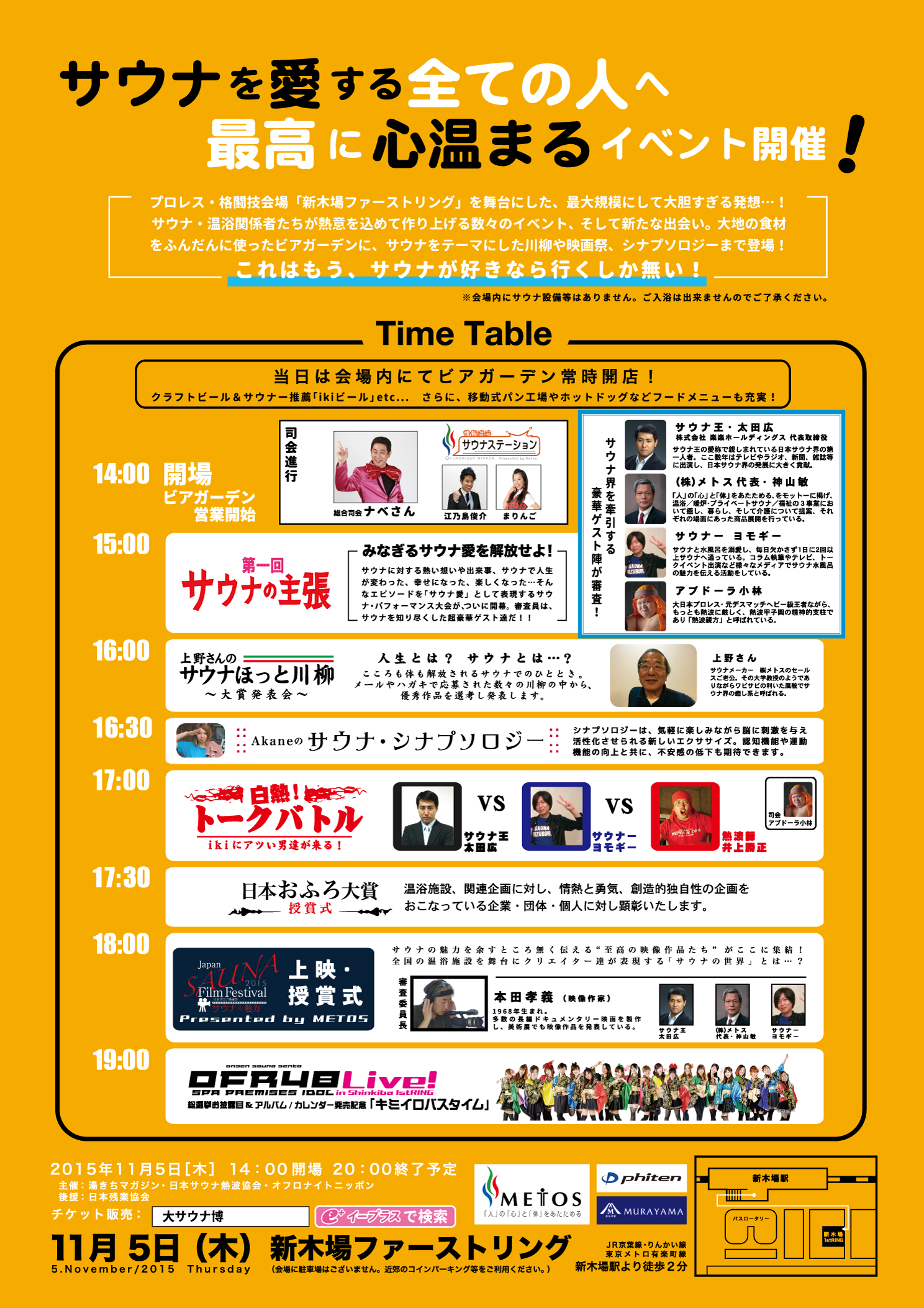 11月5日木曜 午後6時開始(大サウナ博は午後2時開場予定) 大サウナ博(新木場ファーストリング)