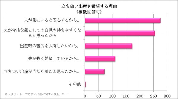 立ち会い出産を希望すると答えた人に、その理由を聞きました。「夫がそばにいると安心するから。」という意見が最も多く聞かれました。一方次に多かったのが、「夫が今後父親になるという自覚を持ちやすくなると思ったから。」という意見でした。立ち会い出産に臨む理由として出産時の心細さや、夫の父親になるという自覚の有無が大きく関係しているようです