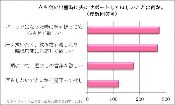 立ち会い出産時に夫にサポートしてもらいたいことを聞きました。結果、「安心させて欲しい」という意見が最も多く、次いで「臨機応援に対応して欲しい」という意見も多く聞かれました。立ち会い出産を控えている場合、予め夫婦でどのようなサポートや気遣いが必要か話し合っておくと良いかもしれません。
