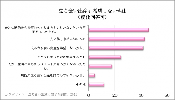 立ち会い出産を希望しない人にその理由を伺いました。「 夫との関係が立ち会い出産を経験することによって変わってしまうかもしれないと思ったから」、という意見が一番多く聞かれました。夫に構う余裕が無いことや、夫が側にいると逆に緊張するといった心配をされる方も多いようです。