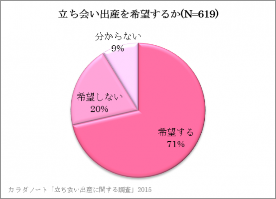 月間300万人が利用する健康知識情報サイト『カラダノート』を運営する(株)プラスアール(本社:東京都港区、代表取締役:佐藤竜也)は、妊娠・育児中の女性619名を対象に「立ち会い出産に関するアンケート調査」を実施いたしました。調査の結果、立ち会い出産を希望する人の割合は7割以上にのぼりました。また、実際に経験した人の意見からは立ち会い出産で出産時の安心感を得られたり、夫婦の絆が深まったりという意見がある一方で、予め心の準備をしておかなかったために良い思い出にならなかったという意見もありました。