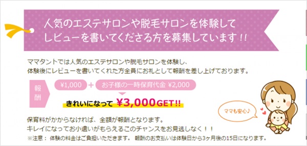 「エステに行ってみたい」「自分にご褒美」「簡単にお小遣い稼ぎをしたい」という方は、是非こちらのページ(http://mamatanto.jp/trial/)からご応募ください。