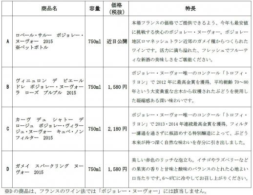 「ドン・キホーテオリジナル ボジョレー・ヌーヴォー2015」は、6年連続の市場最安値を目指すとともに、ドン・キホーテならではの感性豊かな品揃えで、幅広いお客さまに旬の恵みを味わう「ボジョレー・ヌーヴォー」の美味しさと楽しさを提供してまいります。