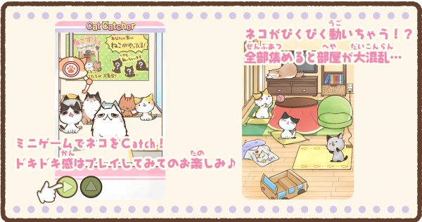 「キャットキャッチャー」でお気に入りのねこをキャッチすると、「キャットルーム」で実際に動くねこを鑑賞することが出来るようになります。