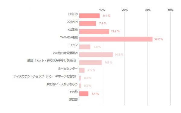 今回のアンケートで、家電製品の購入先をお聞きしたところ、8割以上のママさんが家電量販店で購入されていることがわかりました。その中でも、「YAMADA電機」とお答えになった方は「32.2%」もいらっしゃいました。やはり店舗数が全国的に多い家電量販店が購入先として選ばれるようです。