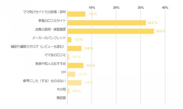 家電とは言え、大きなものを購入する際にやはり製品の性能や質など気になります。一番多かった回答では、35.5%のママさんが「店員の説明・接客態度」で製品の購入を検討されることがわかりました。また、今はネットが普及しているため、32.2%のママさんが家電の口コミサイトを参考に家電の購入を考えられているようです。購入する製品の性質・質の情報は必要ですが、店員の態度・人柄が影響するという結果になりました。