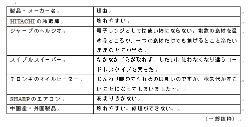 質問4:「「購入して失敗した!」と思う家電製品のコメントをメーカー名と一緒に教えてください。」