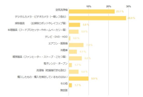 アンケートに回答してくださったママさんの半数は「空気洗浄機」「デジタルカメラ・ビデオカメラ(一眼レフ含む)」を購入・近々購入を考えていらっしゃることがわかりました。やはり新しい家族が増え、小さいお子さんがいらっしゃるご家庭では、生活環境や思い出づくりに一役かってくれる商品が強いようです。