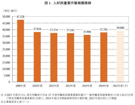 本調査における人材ビジネス市場とは、一般労働者派遣業(人材派遣業)、人材紹介業、再就職支援業、技術者派遣ビジネス、営業・販売支援人材ビジネス、求人情報サービス、製造派遣・請負ビジネス、医療人材サービス、グローバル人材紹介業の9分野を対象とするが、ここでは調査対象のうち、一般労働者派遣業(人材派遣業)、人材紹介業、再就職支援業の主要3分野を取り上げ、分析する。なお、「人材派遣業」の2013年度実績値までは厚生労働省の平成25年度労働者派遣事業報告書のうち、「一般労働者派遣事業」の売上高より引用している。また、「人材紹介業」については、ホワイトカラー職種の人材紹介業を対象とする。