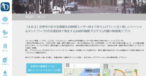 全世界の全ての人々が少しでも裕福に、そして常に支えあっていける新しいソーシャルネットワークの場を提供していければと思い、2015年8月17日スマホアプリ【AD2】が誕生致しました。
