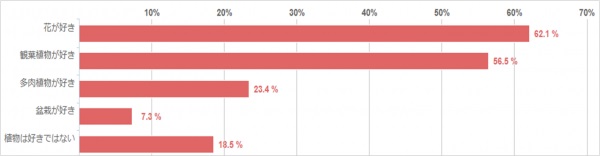 62.1%の方が「花が好き」、56.5%の方が「観葉植物が好き」、23.4%の方が「多肉植物が好き」、7.3%の方が「盆栽が好き」という結果になり、ママさんは植物が好きだということが分かりました。