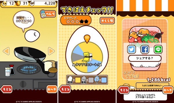 ゲーム内でつくった「ぐでたま」や、オリジナル「ぐでたま」おべんとうは、FaceBookやTwitter、LINEなどのSNS投稿をすることでシェアできます。かわいい「ぐでたま」をどんどんシェアしちゃおう!