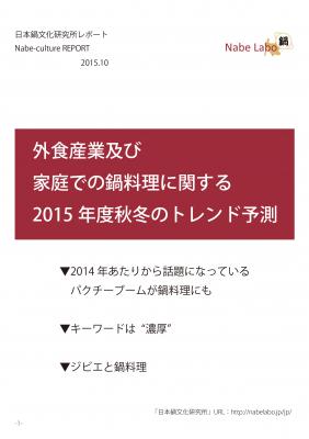 Nabe Labo 日本鍋文化研究所有限責任事業組合が運営する「日本鍋文化研究所」は、10月20日、2015 年第1 弾のレポートとして「外食産業及び、家庭での鍋料理に関する、2015 年度秋冬のトレンド予測」をまとめました。