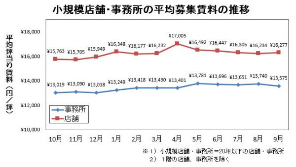 池袋の小規模事務所(20坪以下)の9月度平均募集賃料は、前月から1.2%下降しました。