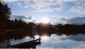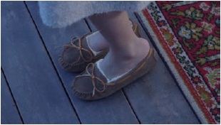 静かな湖畔で肌寒い朝を迎える1人の女性。昨夜の出来事を思い出しながら物想いにふけていると朝日に照らされて素敵な景色が。心も温まるその光景、足元を温めているのはHAWKINSキレらくボアモカシン。
