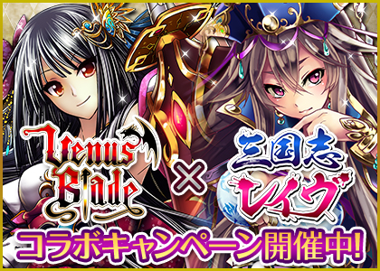 『三国志レイヴ』の可憐な美少女キャラクター達が『ヴィーナス†ブレイド』の世界に登場!一定の条件をクリアする事でコラボレーションキャラクターを入手する事が可能です。