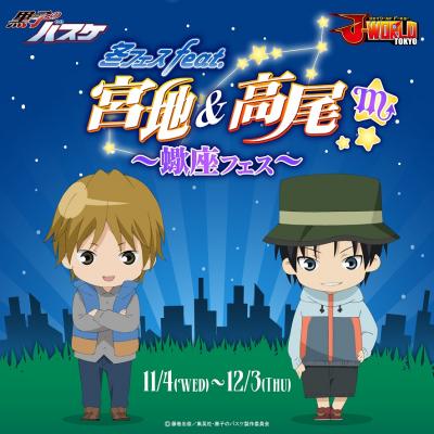 株式会社ナムコが運営する“ジャンプ”作品の世界観で遊べるテーマパーク「J-WORLD TOKYO」(東京・池袋)は、「黒子のバスケ」の登場人物である「宮地清志」(みやじ きよし)と「高尾和成」(たかお かずなり)をフィーチャーしたイベント『冬フェス feat.宮地&高尾 ~蠍座フェス~』を、2015年11月4日(水)から12月3日(木)まで開催します。