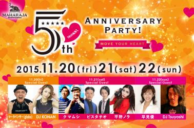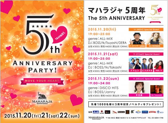 2015年11月20日(金)~11月22日(日)の3日間、日本都市プロダクション株式会社が運営する六本木マハラジャにて「『5th ANNIVERSARY PARTY』5周年記念イベント」を開催いたします。