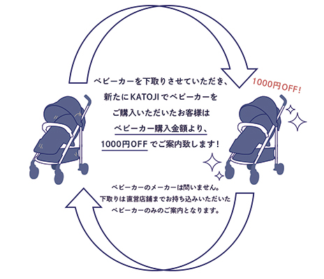 KATOJI直営店3店舗にてベビーカーを下取りし、新たにカトージのベビーカーを購入すると、購入金額より1,000円OFFになる直営店限定サービスです。