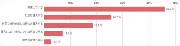 「常備している」というご家庭が46.0%で、半数近くのご家庭で焼肉のたれは常に冷蔵庫にあるという結果になりました。焼肉だけでなく、他の料理にも使えるので、冷蔵庫に常備して利用している方が多いようです。