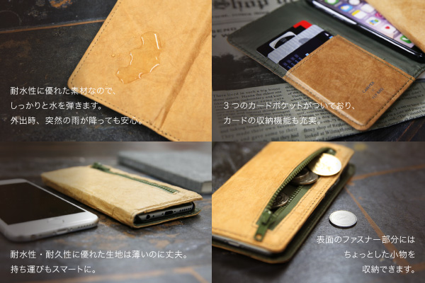 内側には、カードを3枚収納できるポケットを用意し、外側にはちょっとした小物や小銭を収納できるチャック式ポケット。またケースの開閉も簡単にでき、機能性も備わっ ています。