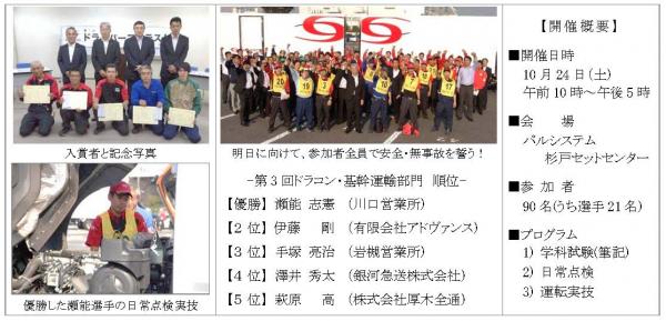 SBSグループのSBSゼンツウ株式会社(社長:近藤治水、埼玉県戸田市)は、10 月24 日、埼玉県杉戸町にて、第3回ドライバーコンテスト(以下、ドラコン)・基幹運輸部門を開催しましたのでお知らせいたします。