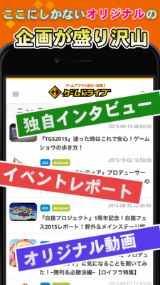 さらにゲームドライブにしかないオリジナルの企画も盛り沢山。有名ゲームプロデューサーのインタビューや、イベント取材記事なども豊富に掲載。ここだけの限定アイテムの配信など、独自のコンテンツを多くの揃えています。スマートフォン向けゲーム以外のゲーム情報ももちろん掲載しているので、ゲーム好きな人は必見のアプリです!
