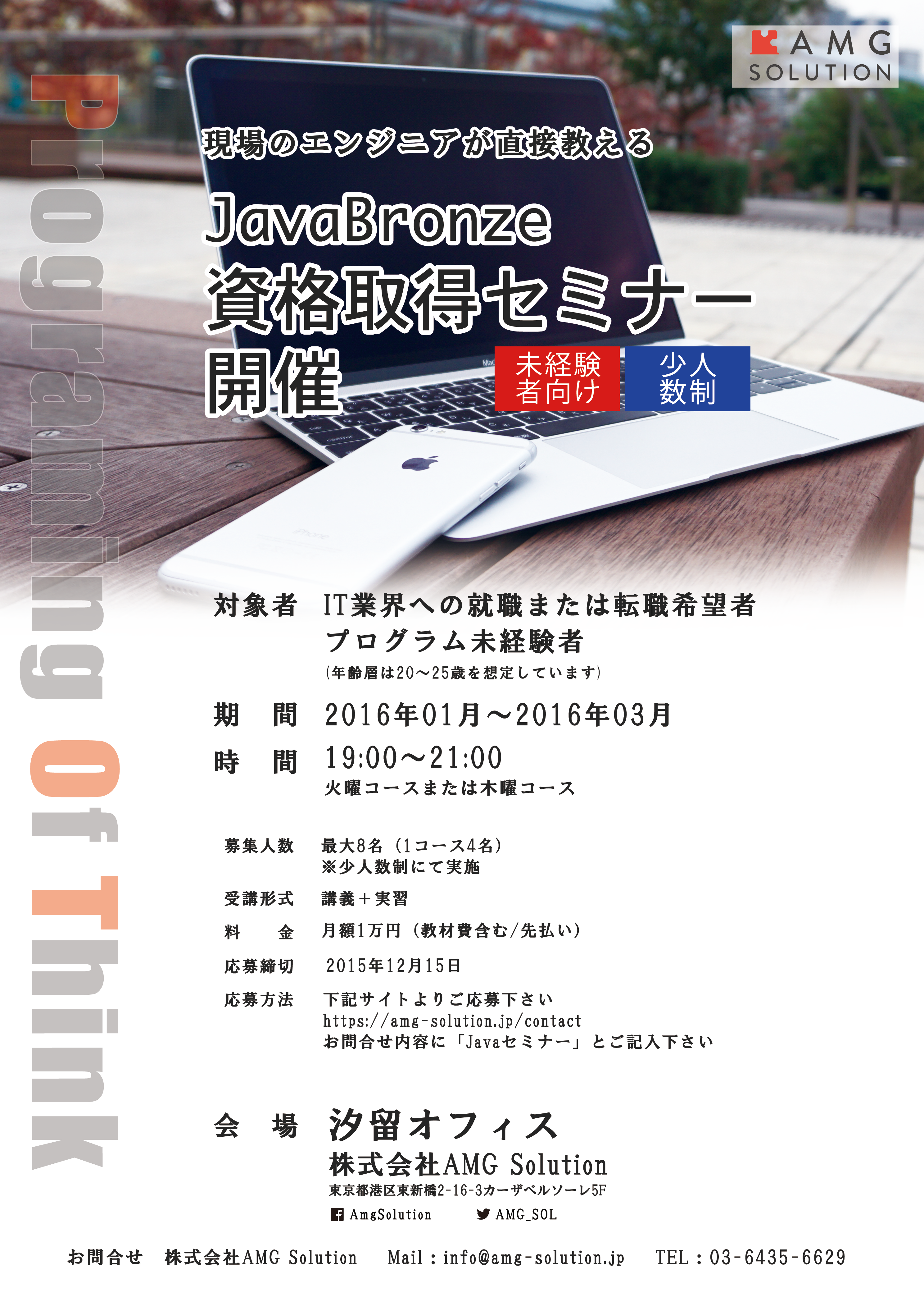 システム開発を業務とする株式会社AMG Solutionは、2016年1月~3月に、Java Bronze資格取得セミナーを開催します。