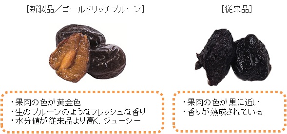 「ゴールドリッチプルーン」は従来品よりも水分を多く残し、ミ・キュイ(半生)に仕上げているため、皮をパリッと割ると見えてくる、フレッシュなままの黄金色の果肉とみずみずしくトロッとした食感が味わえます。