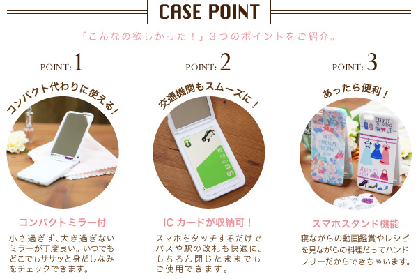 (1) 仕事やプライベートなど身だしなみチェックやがいつでもできるコンパクトミラー付き。小さ過ぎず大き過ぎないミラーがちょうど良い。スマホケースの内側だから周りからは気づかれずこっそりメイク直しも。