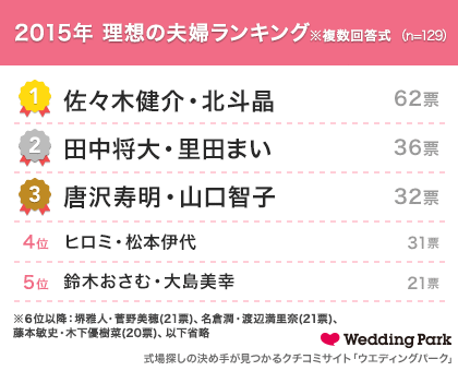 理想の夫婦、2年連続1位は佐々木&北斗、2015年結婚ラッシュで見事1位に輝いた「未来のいい夫婦」は?