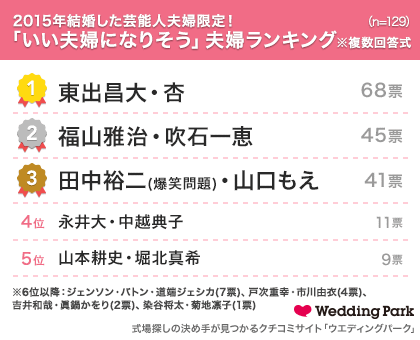 また、『2015年に結婚した芸能人カップルの中で「いい夫婦になりそう」な夫婦を教えて下さい(複数選択)』という質問をしたところ、1位になったのが「東出昌大・杏(68票)」、2位が「福山雅治・吹石一恵(45票)」、3位が「田中裕二(爆笑問題)・山口もえ (41票)」となり、コメントからは「べったりしすぎないけれど、お互いを思いあっている」「等身大で、ほほえましくて、温かい目で見守りたくなる」「やわらかい素敵な家庭になりそう」など、「地に足の付いた、朗らかな夫婦」といった共通点のある夫婦に、「未来のいい夫婦」として、票が多く集まる結果となりました。