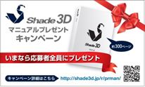 「Shade 3D Basic ver.15 ガイドブック付き」の発売を記念して、「Shade 3D ver.15シリーズ」パッケージ版をご購入者いただいたお客様でお申し込みをいただくともれなく約300ページのマニュアルを無償で進呈いたします。