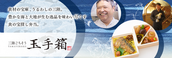 「三陸ごちそう玉手箱~復興デパートメント~」は、食材の宝庫、うるわしの三陸の素材でつくりあげた食の宝探しお弁当店舗です。石巻のブランド魚「金華サバ」、宮城を代表する高級牛「仙台黒毛和牛」、会津古来の鶏の血統を継ぐ地鶏「会津地鶏」、高級魚に例え「沖はも」と称されるイラコ穴子など、こだわりの食材を存分に活かした5商品をご用意いたしました。