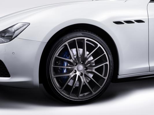 マセラティ伝統のシャドー・ラインにより、トリムをブラックアウト。ドアハンドルはボディ同色のホワイトとし、エレガントなデザインに精悍な雰囲気を加えています。フロント・グリルのトライデントとイタリア語で「光」「稲妻」という意味を持つサエッタ・ロゴにはマセラティのコーポレート・カラーを表すブルー・アクセントが施されたのに加えて、ブルー・ブレーキ・キャリパーを採用。車名が入ったデディケーション・プレートと共に、「スカテナート」が特別なモデルであることを物語っています。さらにマセラティのDNAであるモータースポーツの技術を汲む鍛造の21インチ・チターノ・ホイールを装備。軽量かつ高い強度を持ち、存在感のあるデザインと特別限定のガンメタリック・カラーのホイールは、この特別限定仕様車のスポーティな印象をひときわ高めています。
