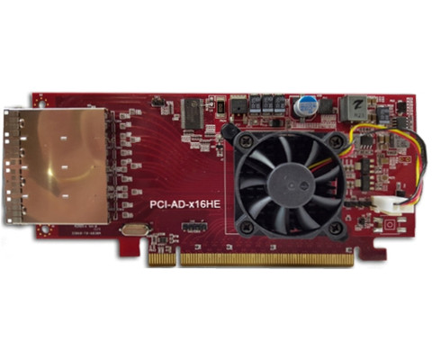 PCIe Gen3 16x バス接続時、最大データ帯域幅 128Gbps のホストバス・ケーブルアダプター(PCI-HBx16-E)は、ノンブロッキング、低遅延動作(150ns)の 8.0GT/s 33 レーン 9 ポート PCIe Gen3 スイッチ Avago PEX9733 を搭載しています。使用には専用ドライバーを必要とせず、PCIe Gen3 16x アップストリーム・ポートと、PCIe Gen3 16x ダウンストリーム・ポートまたは 2 ポートの PCIe Gen3 8x ダウンストリーム・ポートをサポートしています。ホストバス信号は、SRIS モードまたはホットプラグモードをサポートした、4 ポートの標準 mini-SAS HD SFF-8644 4x ケーブルコネクターに接続されます。
