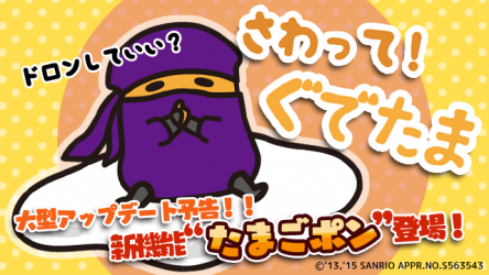株式会社グッドラックスリー(本社:福岡県福岡市、代表取締役CEO:井上和久、以下「グッドラックスリー」)とギャザリング株式会社(本社:東京都千代田区、代表取締役社長:戸田和宏、以下「ギャザリング」)は、株式会社サンリオ(本社:東京都品川区、代表取締役社長:辻信太郎、以下「サンリオ」)よりライセンス許諾を受け、人気キャラクター「ぐでたま」が登場するゲームアプリ『さわって!ぐでたま』(以下、本作)の大型アップデートを2015年11月19日(木)に実施を予定していることをお知らせいたします。