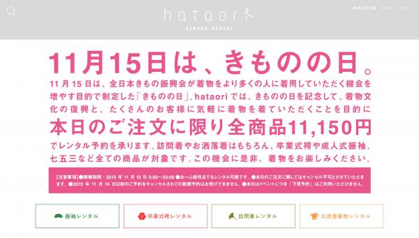 その取り組みの一環とし、2015年11月15(日)限定で卒業式袴や訪問着、10万円以上する成人式振袖などの高額商品含む全商品を対象に11,150円(税込)でレンタル予約受付を実施し、より多くの方々に着物を着用して頂く機会を提供致しました。その結果として、通常の約10倍以上のアクセス数、約20倍のご注文を頂き、より多くの方にhataori(ハタオリ)をご利用頂きました。