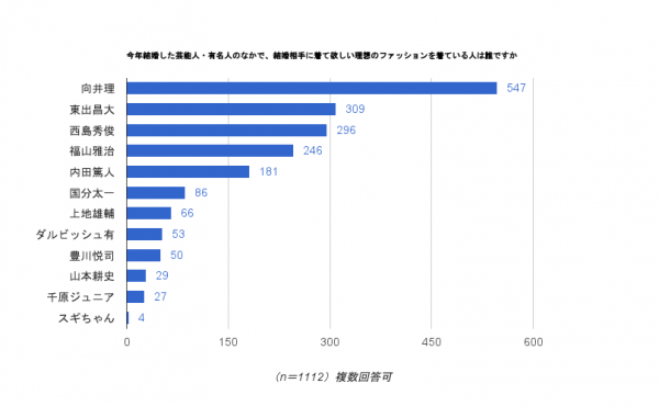 「今年結婚した芸能人・有名人のなかで、結婚相手に着て欲しい理想のファッションを着ている人は誰ですか」という質問をしたところ、1位は俳優の「向井理」さんでした。また、最下位は芸人の「スギちゃん」さんで、4票でした。