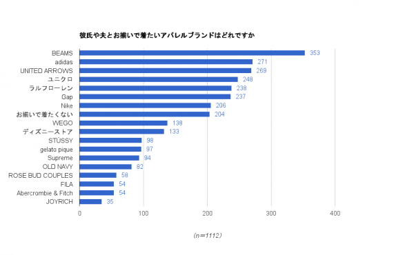 「彼氏や夫とお揃いで着たいアパレルブランド」のランキングでは、「BEAMS」や「UNITED ARROWS」などのセレクトショップのほか、ベーシック、トラディショナルなブランドが上位に集まりました。