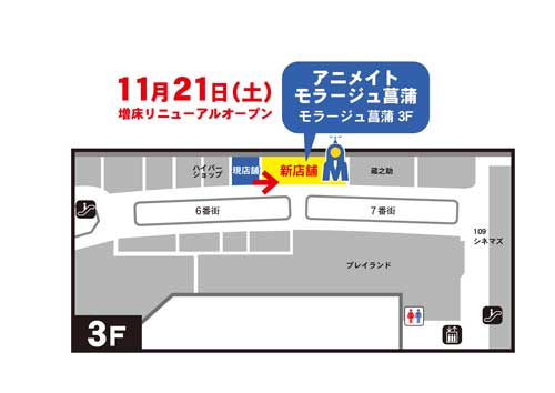 2008年11月28日にグランドオープンしてから“7年”。11月21日、いつもご愛顧いただいておりますアニメイトモラージュ菖蒲が、増床リニューアルオープンいたします。移転先は、現店舗のお隣り。売場が2倍になり、楽しさは無限大に広がります!