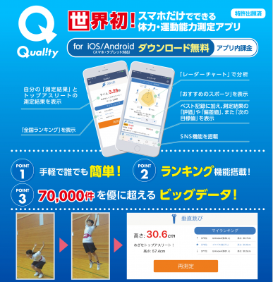 『Quality』(クオリティー)とは、児童からトップアスリートまで幅広い層に対応した“世界初”の体力・運動能力を分析し評価するスマートフォン用アプリです。