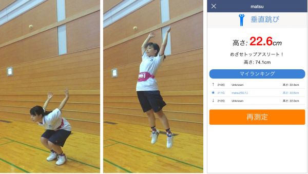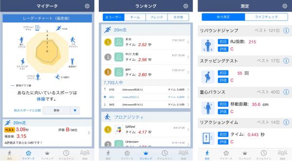 スマートフォンを体に密着させた状態で、簡単な測定をするだけで、体力・運動能力の分析をおこない、レーダーチャート表示と共に、全国ランキング、全国偏差値、評価、次の目標数値などを表示します。