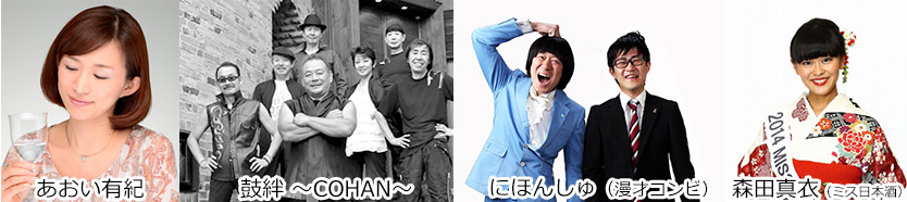 MCはあおい有紀(フリーアナウンサー、酒サムライ)さん、出演者は海外からも大きな反響を呼んでいる史上最強の和太鼓グループ「鼓絆~COHAN~」が登場。更に笑いで日本酒の魅力を伝える漫才コンビの「にほんしゅ」やミス日本酒の森田真衣さんがゲストとして登場し、会場を彩ってくれます。
