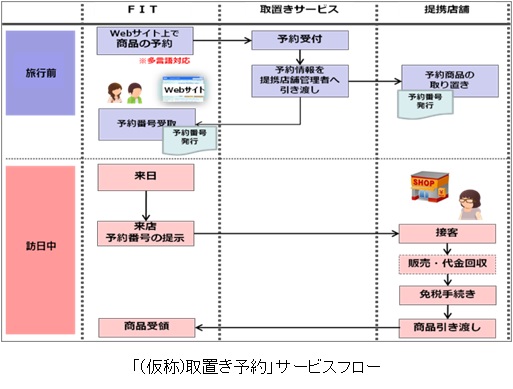 FITの買い物の利便性向上及び店舗送客を目的に、凸版印刷(株)と共同で、訪日前にインターネット上で商品の購入予約ができる、「(仮称)取り置き予約」サービスを開発・展開。地方の事業者を含め多くの流通小売事業者の参画を募ります。旅行者は、日本で購入したい商品を事前に予約し、店頭にて決済及び免税手続きを行うだけ。売れ筋商品を確実に購入することが出来、買い物時間を短縮することでゆっくりと観光地巡りをしていただくことが可能です。