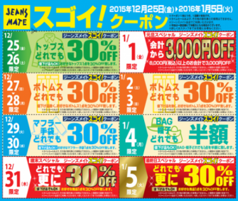 11月23日(月)より全国のジーンズメイト各店舗及びジーンズメイト公式通販サイト「STREET(ストリート) URL:http://estore.jeansmate.co.jp/」でお買い物されたお客様に【ジーンズメイト スゴイ!クーポン】を配布いたします。年末年始のお買い得期間中に使用できるお得なクーポンとなっております。