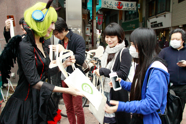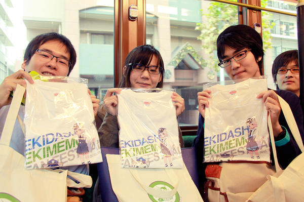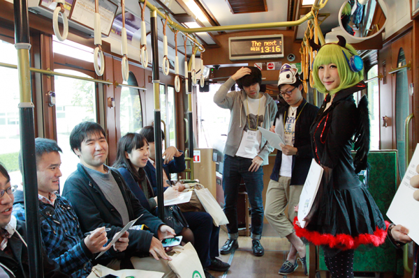 都電荒川線「三ノ輪橋駅」前の広場にて受付・集合しました。「ステーションメモリーズ!」でユーザーのパートナーとして登場する「でんこ」のキャラクターのひとつ、「やちよ」に扮したコスプレイヤーの方にアシスタントとしてお手伝いいただき、参加者の皆様にイベントグッズをお渡ししました。