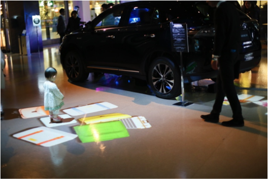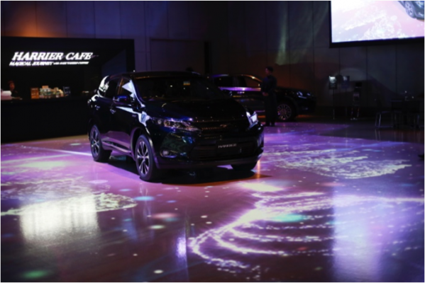 また、お客様がハリアーに近づくことにより、旅行鞄やプレゼントボックスが車から転がり出たり、花吹雪が舞う等の動く映像をお楽しみいただくインタラクティブなアート・イベントとして、凡そ2000人(11月22日、23日両日総計)のお客様にご来場いただきました。