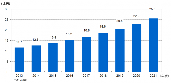 国内B2C EC(企業と消費者間の電子商取引)市場は、2014年度の12.6兆円から2021年度には倍増し、25.6兆円に達する見込み。携帯端末の普及に伴い、時間や場所を問わずにECを利用できるようになったことが市場の成長を後押ししている(図3)。